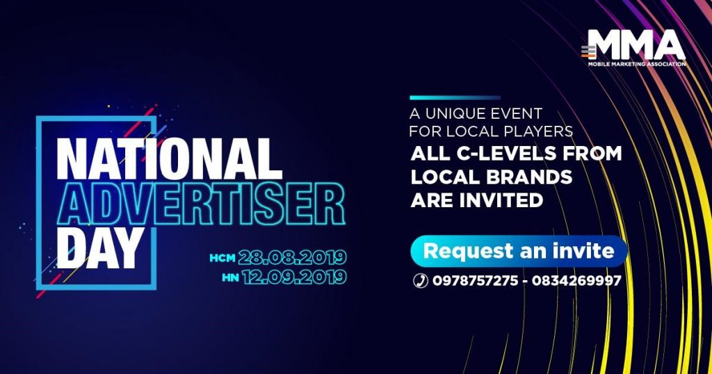 Lần đầu tiên, Hiệp hội Mobile Marketing (MMA) Việt Nam cho ra mắt sự kiện National Advertiser Day 2019 dành riêng cho nhãn hàng nội địa Việt Nam. Sự kiện sẽ được tổ chức vào ngày 28/08/2019 tại TP. Hồ Chí Minh và vào ngày 12/09/2019 tại Hà Nội với nhiều nội dung tiêu biểu dành cho các nhà tiếp thị trong nước.