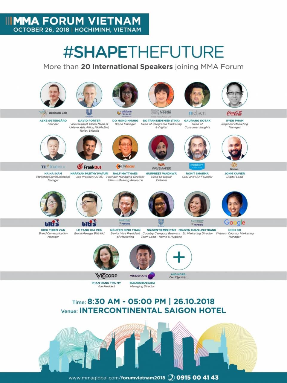 Gần 30 diễn giả là những chuyên gia đầu ngành về truyền thông, marketing cũng như lĩnh vực di động, kĩ thuật số đến từ các doanh nghiệp đang tiên phong trong tiếp thị di động như Nestlé, Unilever, Unicharm,… sẽ có mặt tại Diễn đàn Tiếp thị Di động 2018 nhằm chia sẻ những xu hướng tiếp thị di động trong khu vực, những đánh giá, kinh nghiệm từ góc nhìn của nhãn hàng. Bên cạnh đó, gần 500 người tham dự là đại diện của các doanh nghiệp lớn như Coca-Cola, Suntory Pepsico, Friesland Campina…, những doanh nghiệp Việt Nam đang dẫn đầu thị trường như Biti’s, TH True Milk, VNG,…, những công ty truyền thông toàn cầu như Group M, Nielsen, Decision Lab, Starcom, Wavemaker,… cũng sẽ cùng chia sẻ và thảo luận về các chủ đề tại Diễn đàn.